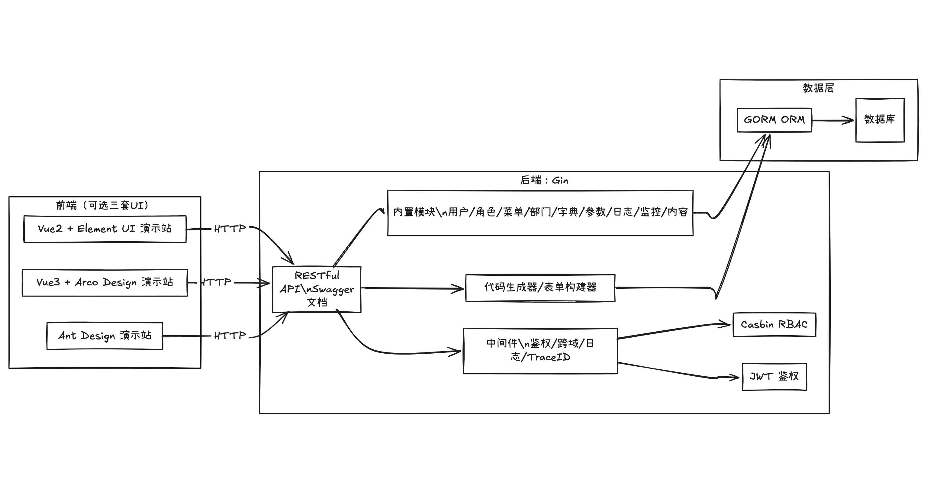 | 技术栈 | Gin + Vue(Element/Arco/Antd) | Go + 多框架适配(gin/beego/echo等),主题化 Admin 面板 | Gin + Vue3 + Vite(前端),丰富后台基建 |