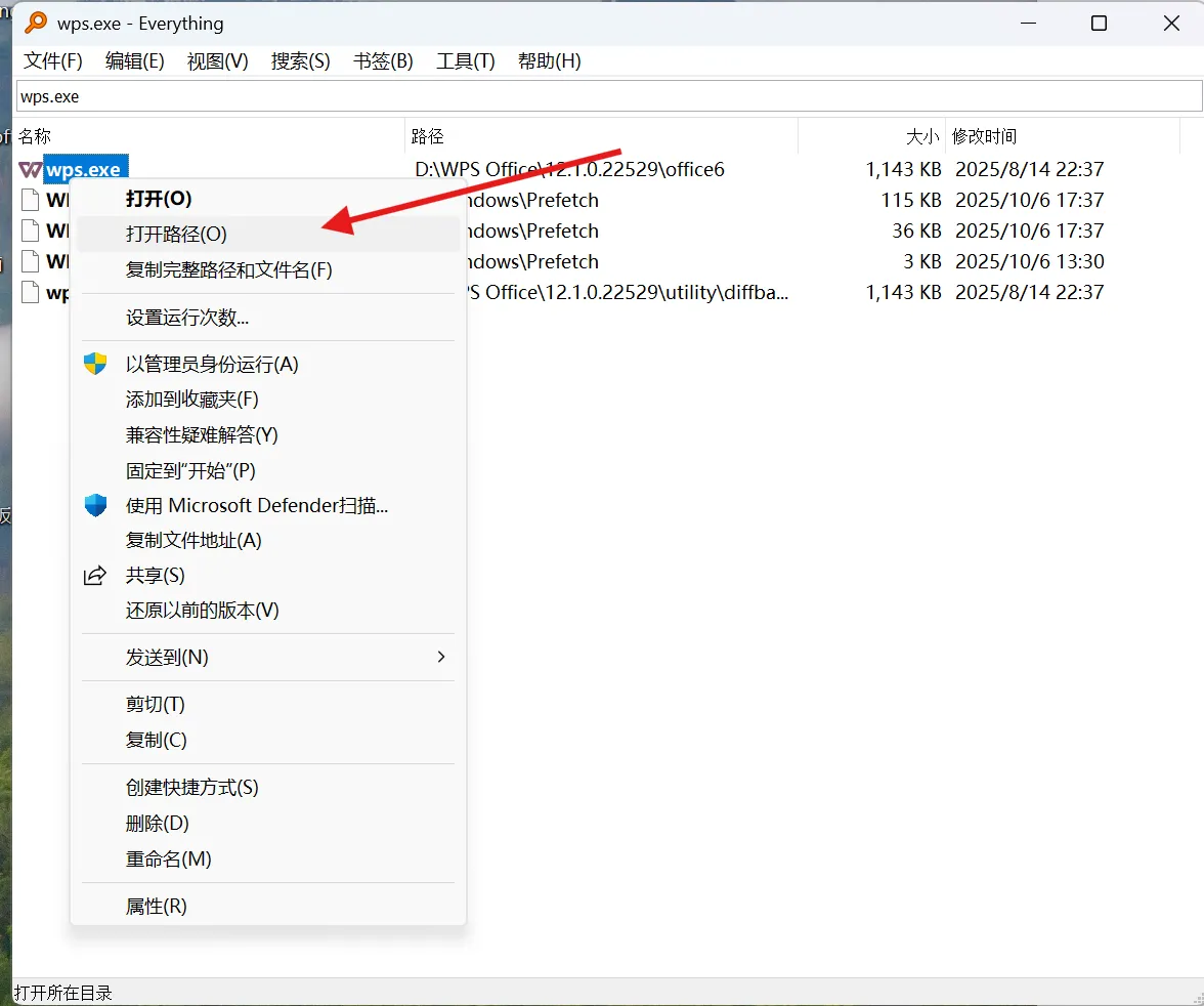 打开 Everything,直接在搜索框里输入软件的 “启动文件名”(比如 WPS 的启动文件是wps.exe,QQ 是QQ.exe,微信是WeChat.exe)。