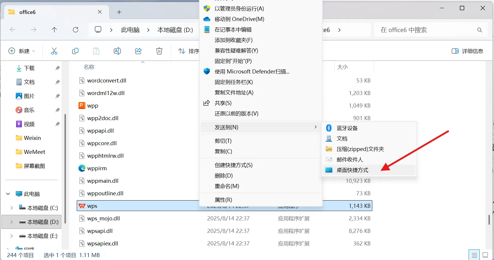 找到正确的.exe 启动文件后(比如我的wps.exe在D:\Program Files\WPS Office\11.8.2.12085\office6目录下),右键点击这个.exe 文件,选择「打开文件所在的目录」—— 这一步是为了确认启动文件的完整路径,避免后续创建快捷方式时出错。