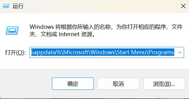 - 按下键盘「Win+R」组合键,打开 “运行” 窗口,输入%appdata%\Microsoft\Windows\Start Menu\Programs,然后点击「确定」;
