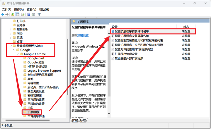 在 管理模板 下找到 经典管理模板(ADM) -> Google -> Google Chrome -> 扩展程序