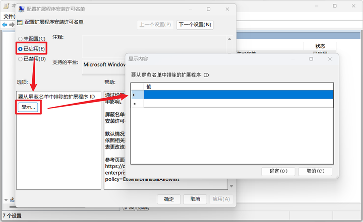 双击 配置扩展程序安装许可名单,将其改为【已启用】,然后点击【显示】进入白名单列表。