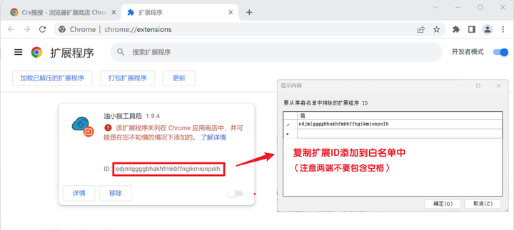 找到无法开启的应用,复制不可用的扩展ID,例如:edjmlggggbhakhfmkbffngikmionpolh 填入白名单中,然后点击确定。