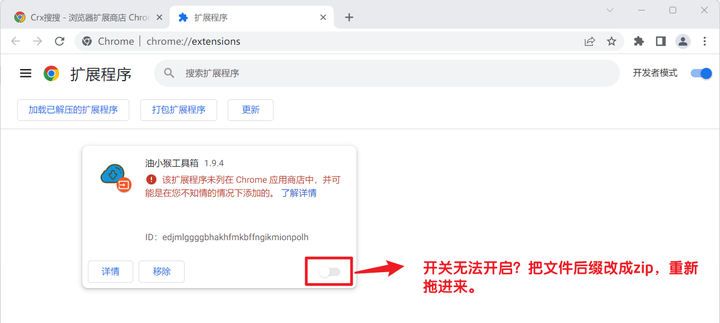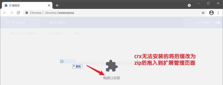 将扩展文件后缀由 crx 改为 zip,把 zip 文件拖动到扩展管理页面。(若拖动没反应,请刷新本页)