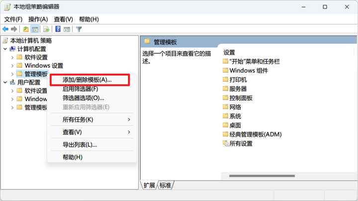 点击 计算机配置 -> 管理模板,右键菜单 添加/删除模板 -> 添加,选择刚才解压的 chrome.adm 文件,然后关闭对话框即可。