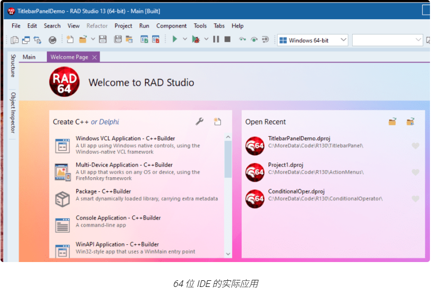 首次提供完整的 Windows 64 位 IDE,支持 Delphi 与 C++ 应用构建与调试。