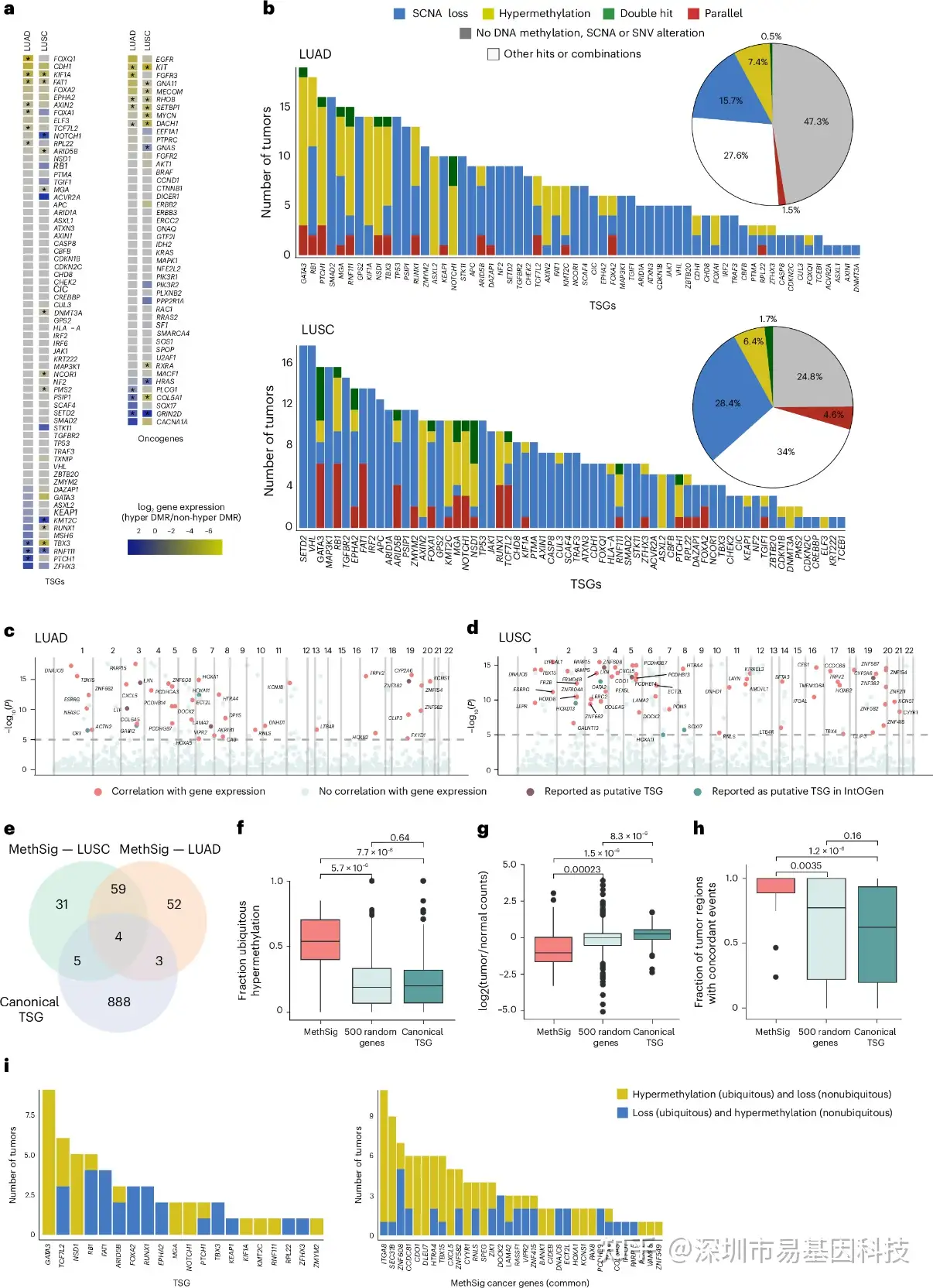 h. MethSig癌症基因、随机基因集和经典TSGs中同时出现DNA高甲基化和拷贝数改变的区域占比。一致事件包括DNA高甲基化和拷贝数丢失,或低甲基化与拷贝数增加和扩增(t检验)。