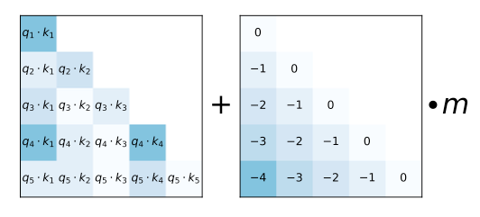 左侧的矩阵展示了每一对query-key的注意力得分。右侧的矩阵展示了每一对query-key之间的距离。m是固定的参数,每个注意头对应一个标量。