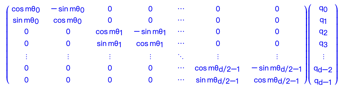 由于这里𝑓函数的定义其实对应着向量的旋转,所以这种位置编码也就叫做“旋转位置编码”。基于𝑓函数的矩阵形式以及内积的线性叠加性,可以得到下面形式(具体推导感兴趣的可以看苏剑林老师的博客,本文主要介绍思想)