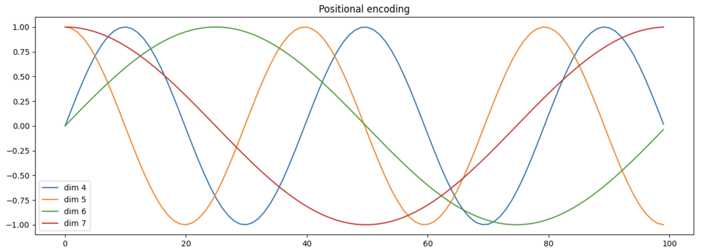 import math import torch import torch.nn as nn import numpy as npclass PositionalEncoding(nn.Module):def __init__(self, d_model: int, dropout_prob: float, max_len: int = 5000):super().__init__()self.dropout = nn.Dropout(dropout_prob)encodings = self.get_positional_encoding(d_model, max_len)self.register_buffer('positional_encodings', encodings, False)@staticmethoddef get_positional_encoding(d_model: int, max_len: int):position = torch.arange(0, max_len, dtype=torch.float32).unsqueeze(1)two_i = torch.arange(0, d_model, 2, dtype=torch.float32)div_term = torch.exp(two_i * -(math.log(10000.0) / d_model))encodings = torch.zeros(max_len, d_model)encodings[:, 0::2] = torch.sin(position * div_term)encodings[:, 1::2] = torch.cos(position * div_term)return encodings.unsqueeze(0).requires_grad_(False)def forward(self, x: torch.Tensor):pe = self.positional_encodings[:x.shape[1]].detach().requires_grad_(False)return self.dropout(x + pe)def _test_positional_encoding():import matplotlib.pyplot as pltplt.figure(figsize=(15, 5))pe = PositionalEncoding.get_positional_encoding(20, 100)print(pe.shape)plt.plot(np.arange(100), pe[:, 0, 4:8].numpy())plt.legend(["dim %d" % p for p in [4, 5, 6, 7]])plt.title("Positional encoding")plt.show()if __name__ == '__main__':_test_positional_encoding()