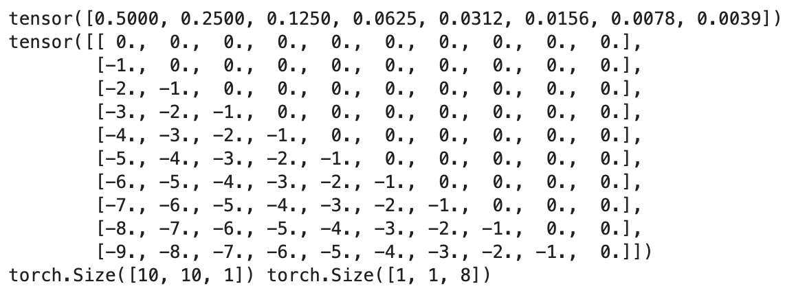 可以看到下面打印出来的第一行就是给不同head的系数𝑚,下面的矩阵就是一个基于两个token 之间距离计算的偏置矩阵。