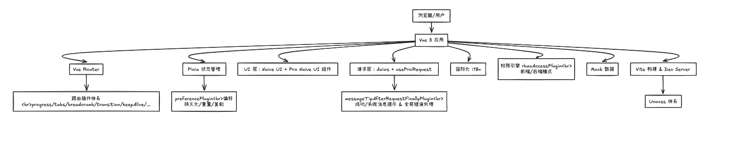 naive-ui-pro 的“插件化架构”正是为此而生:把这些高频能力做成可插拔的路由插件,分别负责一件小事,再统一织入路由生命周期。官方文档总结得很清楚:更易理解、更易维护、更易扩展,像搭积木一样演进系统,而不是一次性写死复杂度。