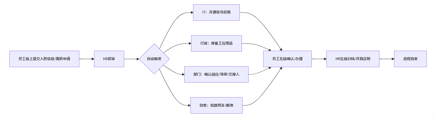 | 流程繁杂低效 | 手工操作多,纸质流转慢,部门协调难,进度不透明。 | 工作流引擎驱动端到端自动化流转;任务自动触发指派;进度实时可视化监控。 | 流程效率大幅提升,HR协调负担显著减轻。 |