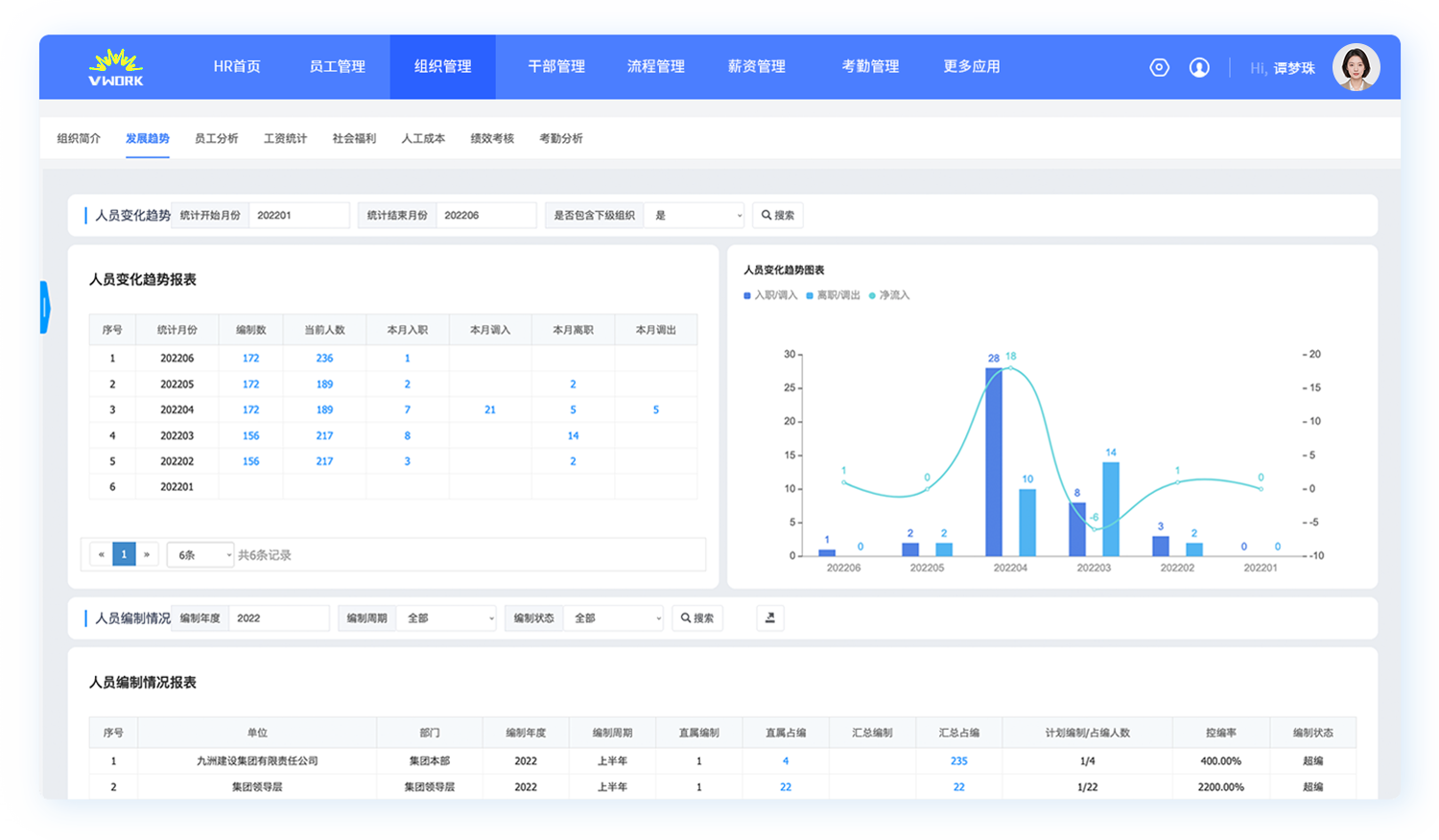 组织管理系统沉淀了全量、实时、准确的人才数据(包括入离职数据本身,如离职率、离职原因分析、入职成功率、试用期通过率等)。HR可以: