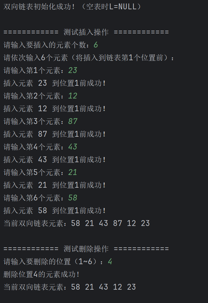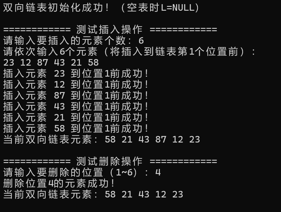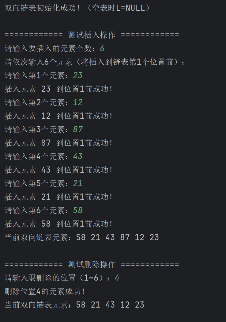 int main() {DuLinkList L;int n, e, delPos;// 1. 初始化双向链表(不带头节点,空表时L=NULL)if (InitDuLinkList(L) != OK) {cout << "双向链表初始化失败!" << endl;return 1;}cout << "双向链表初始化成功!(空表时L=NULL)" << endl;// 2. 测试插入操作(所有元素插入到第1个位置前,即逆序存储)cout << "\n============ 测试插入操作 ============" << endl;cout << "请输入要插入的元素个数:";cin >> n;if (n <= 0) {cout << "元素个数必须为正整数!" << endl;return 1;}cout << "请依次输入" << n << "个元素(将插入到链表第1个位置前):" << endl;for (int k = 1; k <= n; k++) {cin >> e;if (ListInsert_DuL(L, 1, e) == OK) {cout << "插入元素 " << e << " 到位置1前成功!" << endl;} else {cout << "插入元素 " << e << " 到位置1前失败!" << endl;}}PrintDuLinkList(L);// 3. 测试删除操作cout << "\n============ 测试删除操作 ============" << endl;cout << "请输入要删除的位置(1~" << n << "):";cin >> delPos;if (ListDelete_DuL(L, delPos) == OK) {cout << "删除位置" << delPos << "的元素成功!" << endl;PrintDuLinkList(L);} else {cout << "删除位置" << delPos << "不合法或元素不存在!" << endl;}// 4. 释放内存(遍历删除所有节点,不带头节点无需删表头)DuLNode *p = L, *q;while (p != NULL) {q = p;p = p->next;delete q; // 释放当前节点}L = NULL; // 避免野指针return 0;