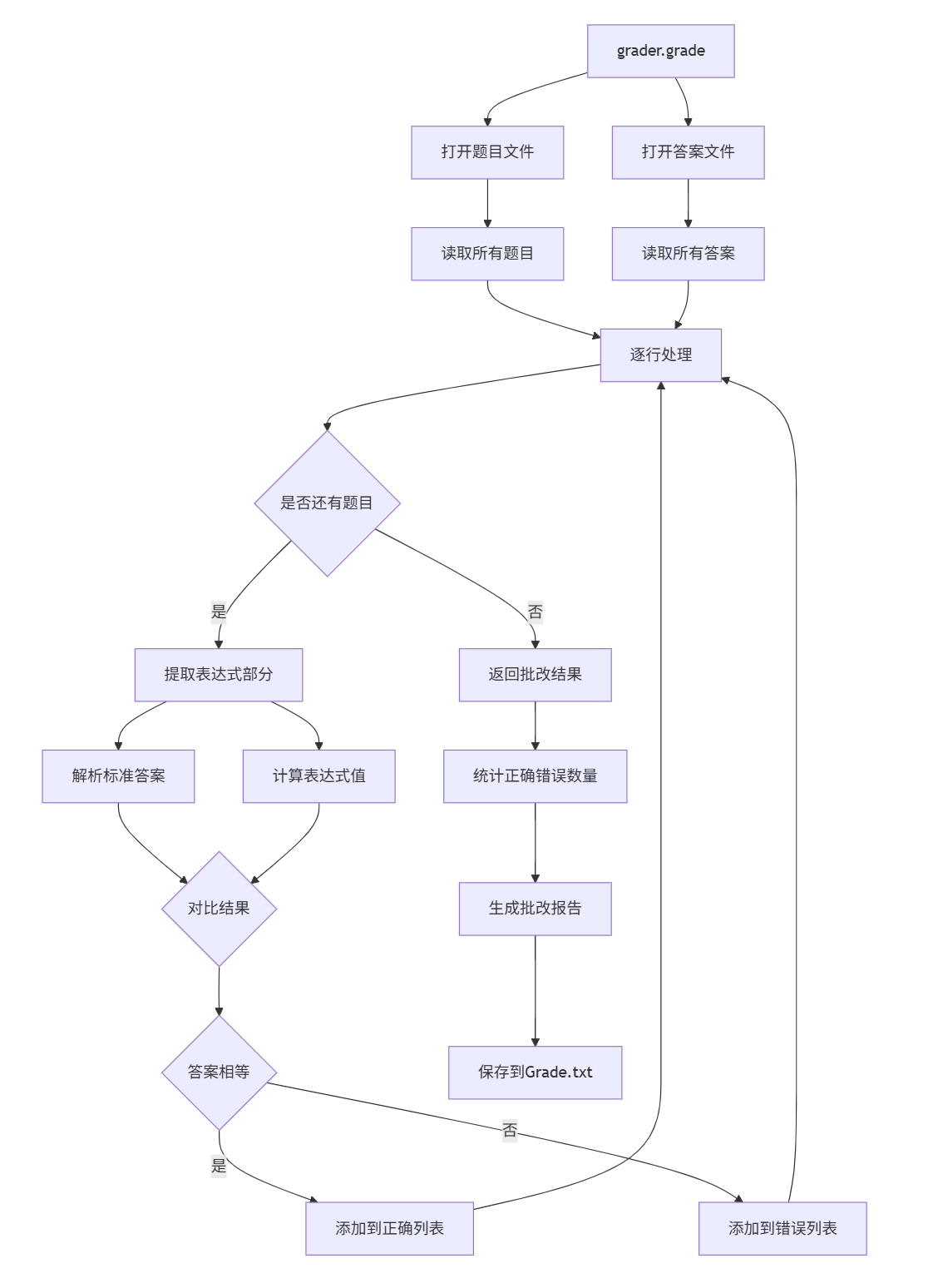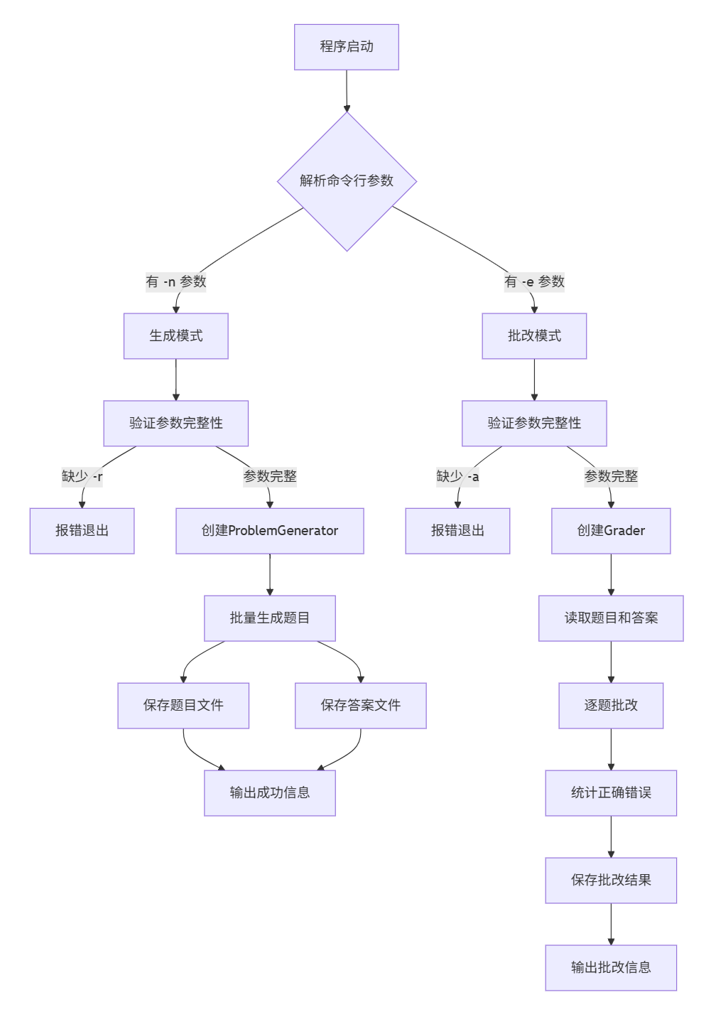 设计思路: 使用二叉树结构表示算术表达式,在计算过程中同时验证算术规则(减法不产生负数,除法结果为真分数)