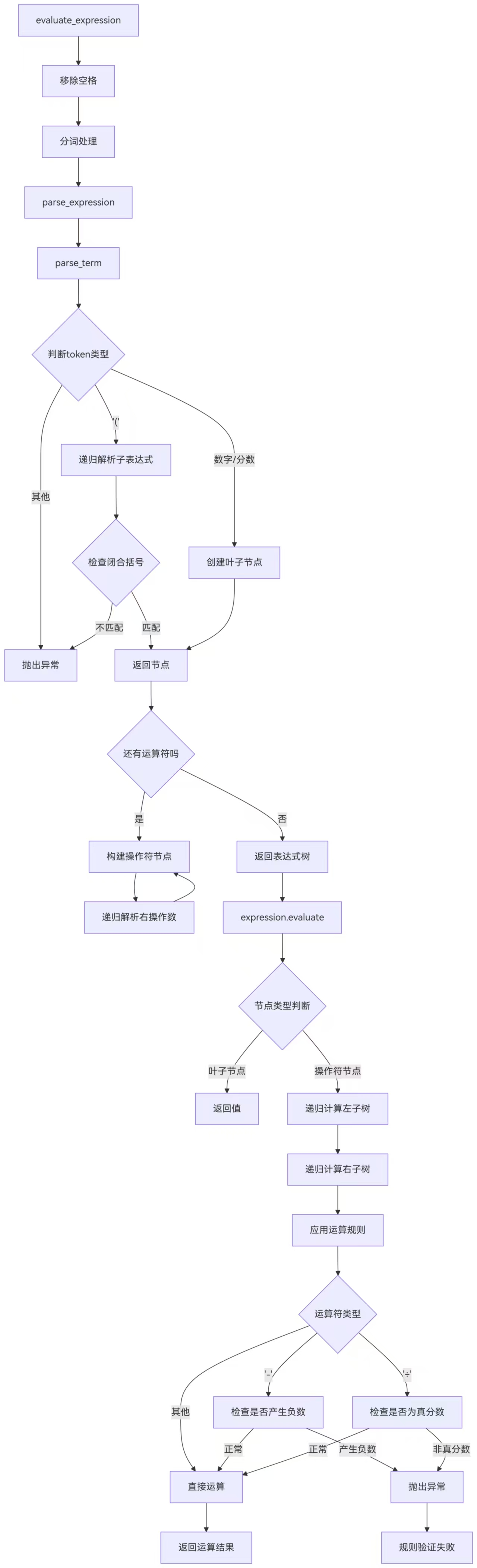 class ExpressionNode:def evaluate(self) -> FractionNumber:"""递归计算表达式值,同时验证运算规则"""if self.is_leaf():return self.valueleft_val = self.left.evaluate()right_val = self.right.evaluate()if self.operator == '-':# 确保不产生负数if left_val < right_val:raise ValueError("Subtraction result cannot be negative")return left_val - right_valelif self.operator == '÷':# 确保结果是真分数if left_val >= right_val:raise ValueError("Division result must be a proper fraction")return left_val / right_val